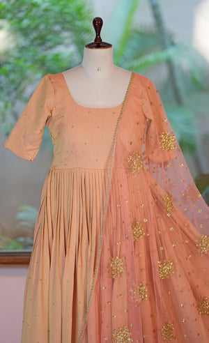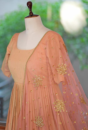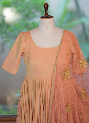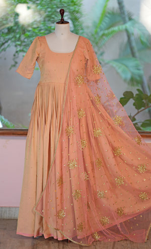Dual toned peachish beige falling raw silk with stone studded long gown. It is paired with peach net duppata with sequin work all over. Set contains gown and duppata. Pant is not included.