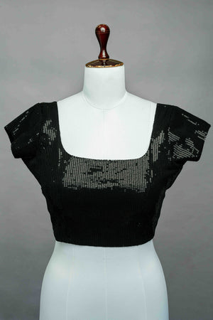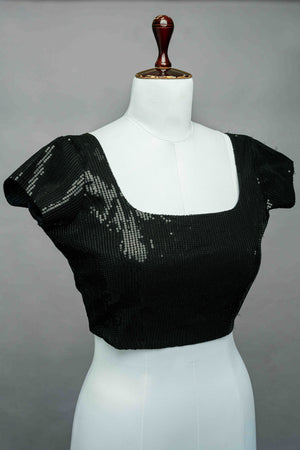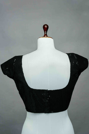 Black sequin worked georgette blouse. It has back closure with hooks. It has U neck detailing in the front and back. Front neck is 7 inches deep and back neck is 9 inches deep. Sleeve length is 4 inches.