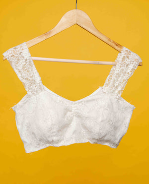 Self weaved white net blouse in sleeveless pattern. It has back closure with hooks.