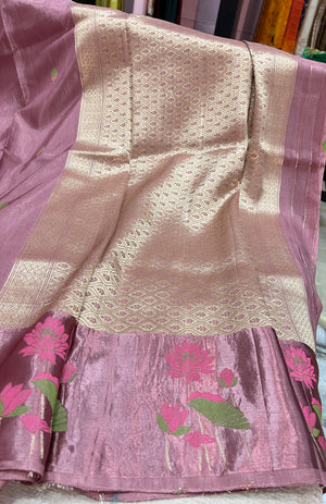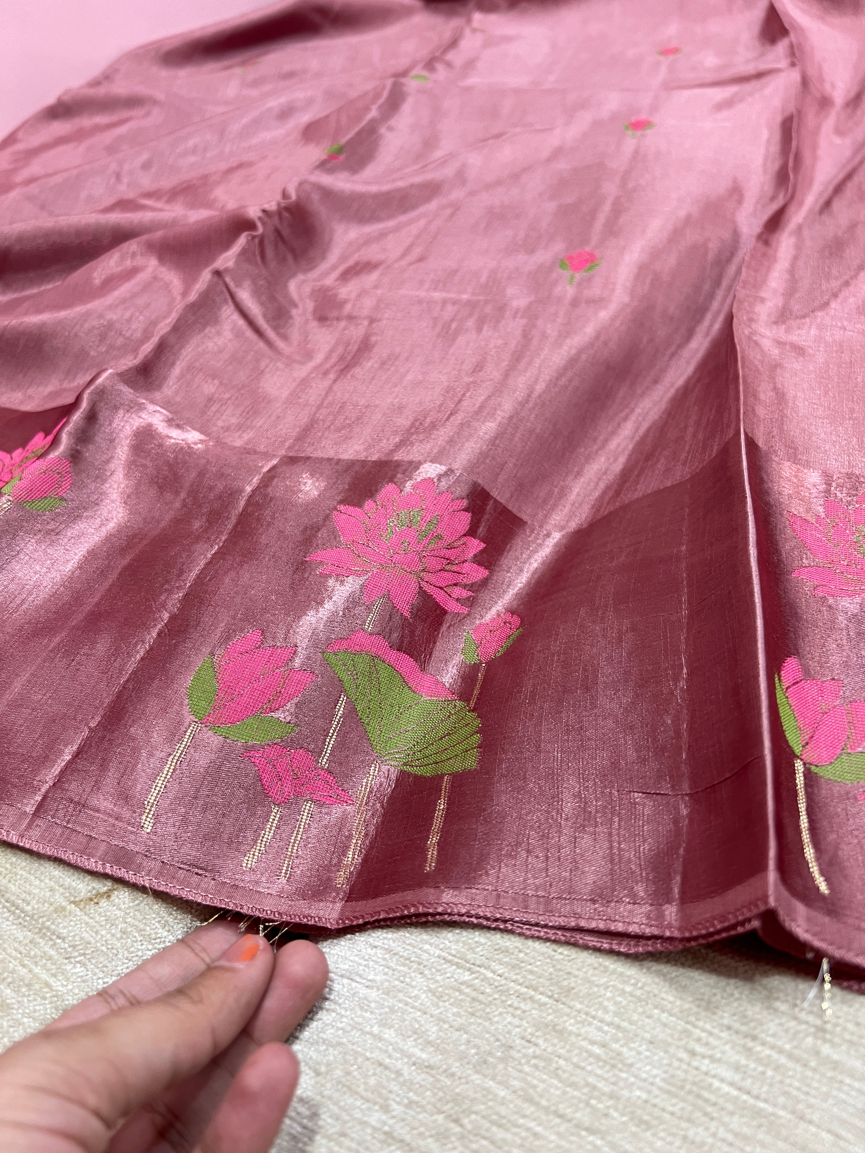 Soft, graceful and one of a kind. This rose pink viscose silk falling saree features a sleek satin border adorned with delicate, unique floral designs - the perfect blend of charm and sophistication. Saree comes with running blouse piece.