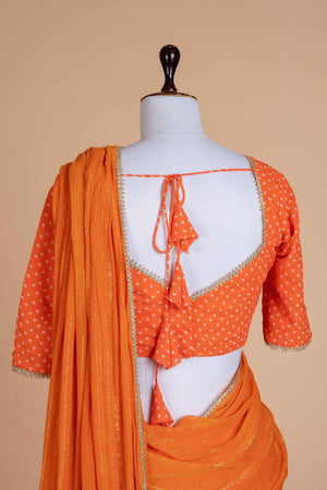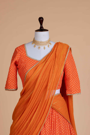 Orange georgette bandhani printed skirt and blouse. Orange georgette duppata with golden zari stripes. Skirt is provided with can can.