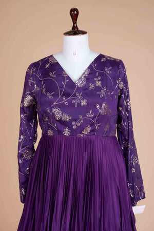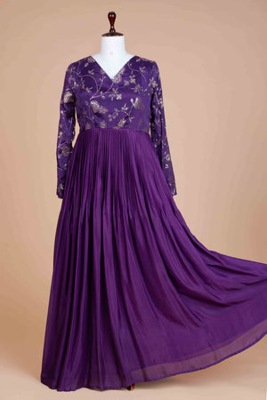 Purple gown with zari thread and sequins. Chinnon flair.