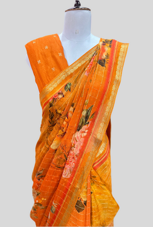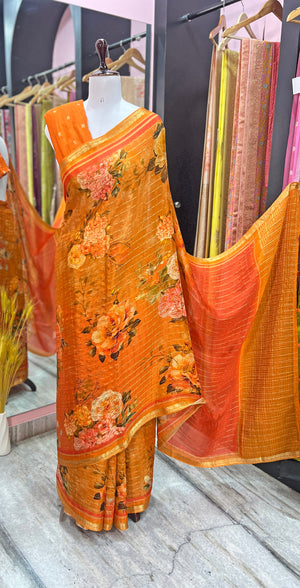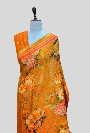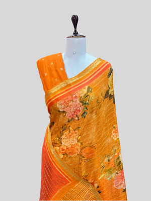 Orange floral printed georgette saree with zari checkered pattern finished with zari border. Saree comes with running blouse piece.