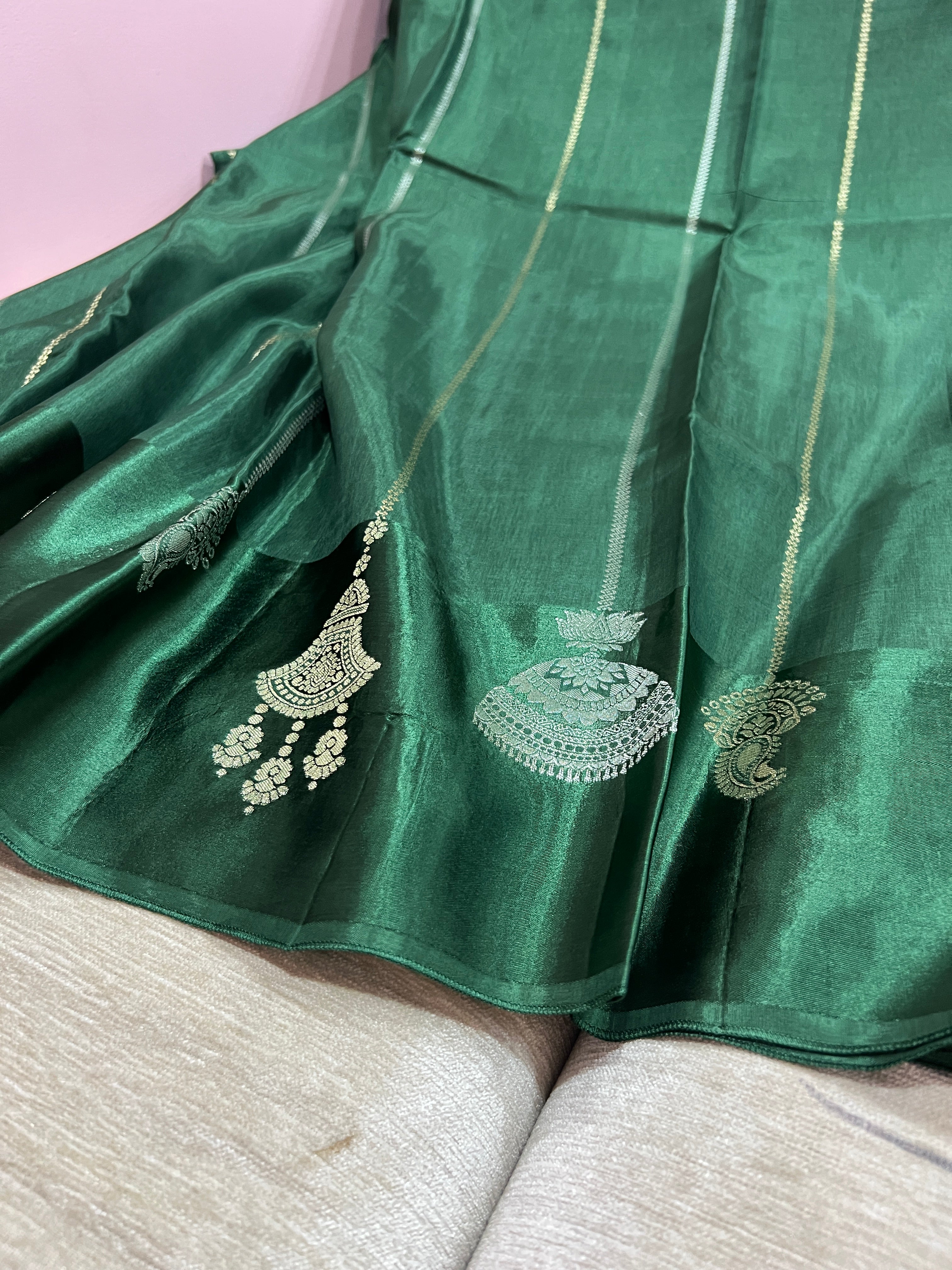 A classic with a twist. This green striped falling silk saree with golden zari weaving and a grand pallu is all things traditional, graceful, and statement worthy - perfect for festive flair or timeless elegance. Saree comes with running blouse piece.