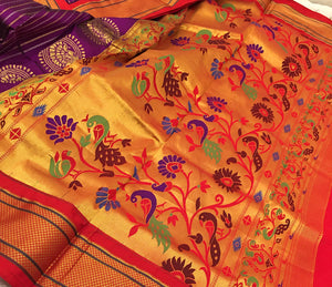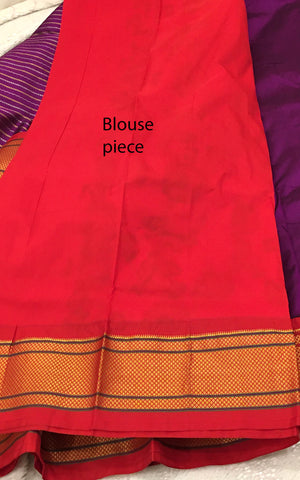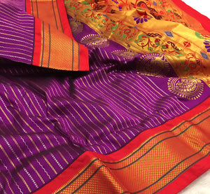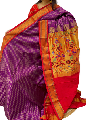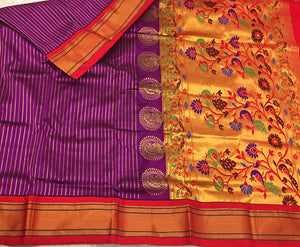 Purple Pure Narayanper silk saree in striped pattern with golden zari borders. Sarees comes with a grand paithani pallu and contrast running blouse piece.