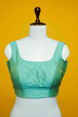 Sea green semi silk sleeveless blouse. It has U neck detailing in front and back. It has back neck closure with hooks. Front neck is 7 inches deep. Back neck is 9 inches deep.
