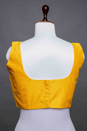 Yellow sleeveless semi raw silk blouse. It has back closure with hooks. Front neck is 7 inches deep. Back neck is 9 inches deep.